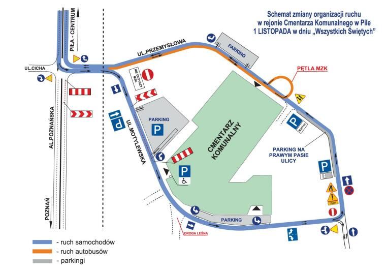 W dniu 1 Listopada podobnie jak w latach ubiegłych celem ułatwienia dojazdu do cmentarza komunalnego na ulicach Motylewskiej i Przemysłowej obowiązywać będzie specjalna organizacja ruchu. Tak jak zawsze ulice te staną się dla pojazdów osobowych ulicami jednokierunkowymi. Ruch dwukierunkowy możliwy będzie wyłącznie dla autobusów komunikacji miejskiej dojeżdżających do bramy cmentarnej przy ul. Przemysłowej.