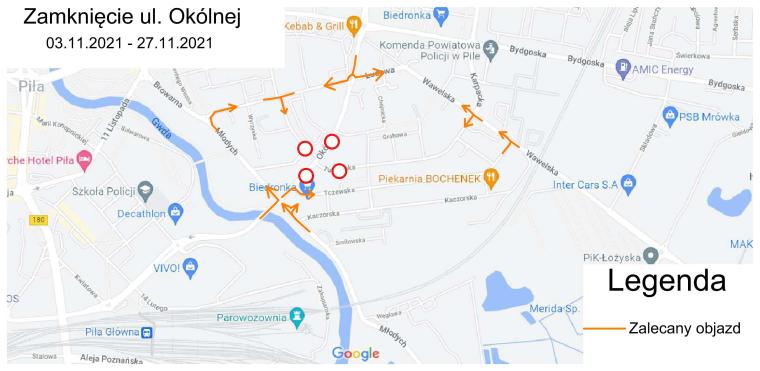 W związku z prowadzoną przebudową skrzyżowania ulic Okólna, Tucholska i Roosevelta w Pile informujemy, że w dniach od 03.11. do 27.11.2021 r. zamknięt...